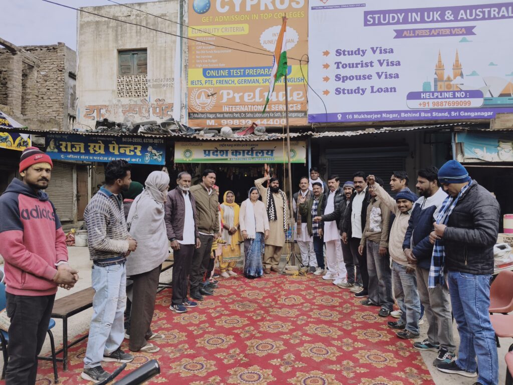 श्रीगंगानगर,26 जनवरी 2026;राष्ट्रीय मजदूर कांग्रेस इंटक द्वारा 77वां गणतंत्रता दिवस पूरे हर्षोल्लास, अनुशासन और देशभक्ति के माहौल में मनाया गया। आयोजन प्रदेश कार्यालय, बस स्टैंड स्थित नेहरू पार्क के निकट किशन टी स्टाल पर हुआ, जहां सुबह से ही संगठन के पदाधिकारी और कार्यकर्ता बड़ी संख्या में एकत्रित हुए।