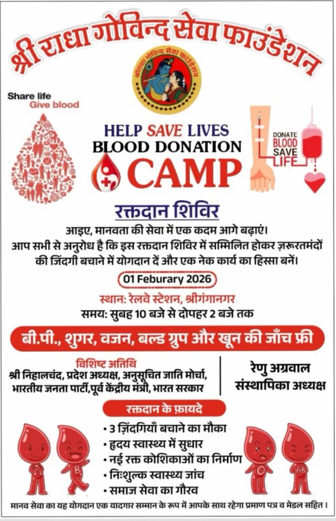 श्रीगंगानगर।मानवता की सेवा, संवेदना और सामाजिक संकल्प को मजबूत करने के उद्देश्य से श्री राधा गोविंद सेवा फाउंडेशन की ओर से 1 फरवरी 2026 को एक विशाल रक्तदान शिविर का आयोजन किया जा रहा है। यह शिविर रेलवे स्टेशन, श्रीगंगानगर परिसर में सुबह 10 बजे से दोपहर 2 बजे तक आयोजित होगा।आयोजन का मुख्य उद्देश्य जरूरतमंद मरीजों के लिए रक्त उपलब्ध कराना और आमजन को रक्तदान के प्रति जागरूक करना है। आयोजकों का कहना है कि एक व्यक्ति द्वारा किया गया रक्तदान तीन जिंदगियों को जीवनदान देने में सहायक होता है, इसलिए समाज के हर सक्षम व्यक्ति को इस महाअभियान से जुड़ना चाहिए।रक्तदान शिविर की विशेषता यह रहेगी कि यहां रक्तदान के साथ-साथ बीपी, शुगर, वजन, ब्लड ग्रुप और खून से जुड़ी अन्य आवश्यक जांचें पूरी तरह नि:शुल्क की जाएंगी, जिससे आम लोगों को अपने स्वास्थ्य की स्थिति जानने का अवसर भी मिलेगा।इस पुनीत कार्यक्रम में विशिष्ट अतिथि के रूप मेंश्री निहालचंद, प्रदेश अध्यक्ष, अनुसूचित जाति मोर्चा, भारतीय जनता पार्टी एवं पूर्व केंद्रीय मंत्री, भारत सरकार शिरकत करेंगे।कार्यक्रम का संयोजन फाउंडेशन की संस्थापक अध्यक्ष रेणु अग्रवाल के नेतृत्व में किया जा रहा है।आयोजकों ने शहरवासियों से अपील की है कि वे अधिक से अधिक संख्या में पहुंचकर रक्तदान करें और मानवता की सेवा में सहभागी बनें। रक्तदान करने वाले सभी दाताओं को प्रमाण पत्र एवं मेडल देकर सम्मानित किया जाएगा, ताकि यह योगदान जीवनभर की स्मृति बन सके।यह रक्तदान शिविर न केवल जरूरतमंदों के लिए जीवन रेखा बनेगा, बल्कि समाज में सेवा और सहयोग की भावना को भी नई दिशा देगा।