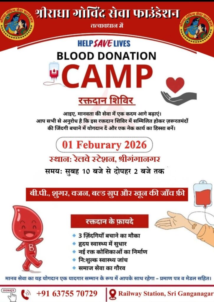 01 फरवरी 2026 (रविवार) रेलवे स्टेशन, श्रीगंगानगर में एक भव्य आयोजन कर रही है।, गंभीर ऑपरेशन से जुड़े मरीज – आप सभी को रक्त की समस्या है। आपका रक्त किसी की अंतिम आशा बन सकती है । जांच निः शुल्क रहेगी—✔️ बी.पी.✔️ शुगर✔️ वजन✔️ ब्लड ग्रुप जांच